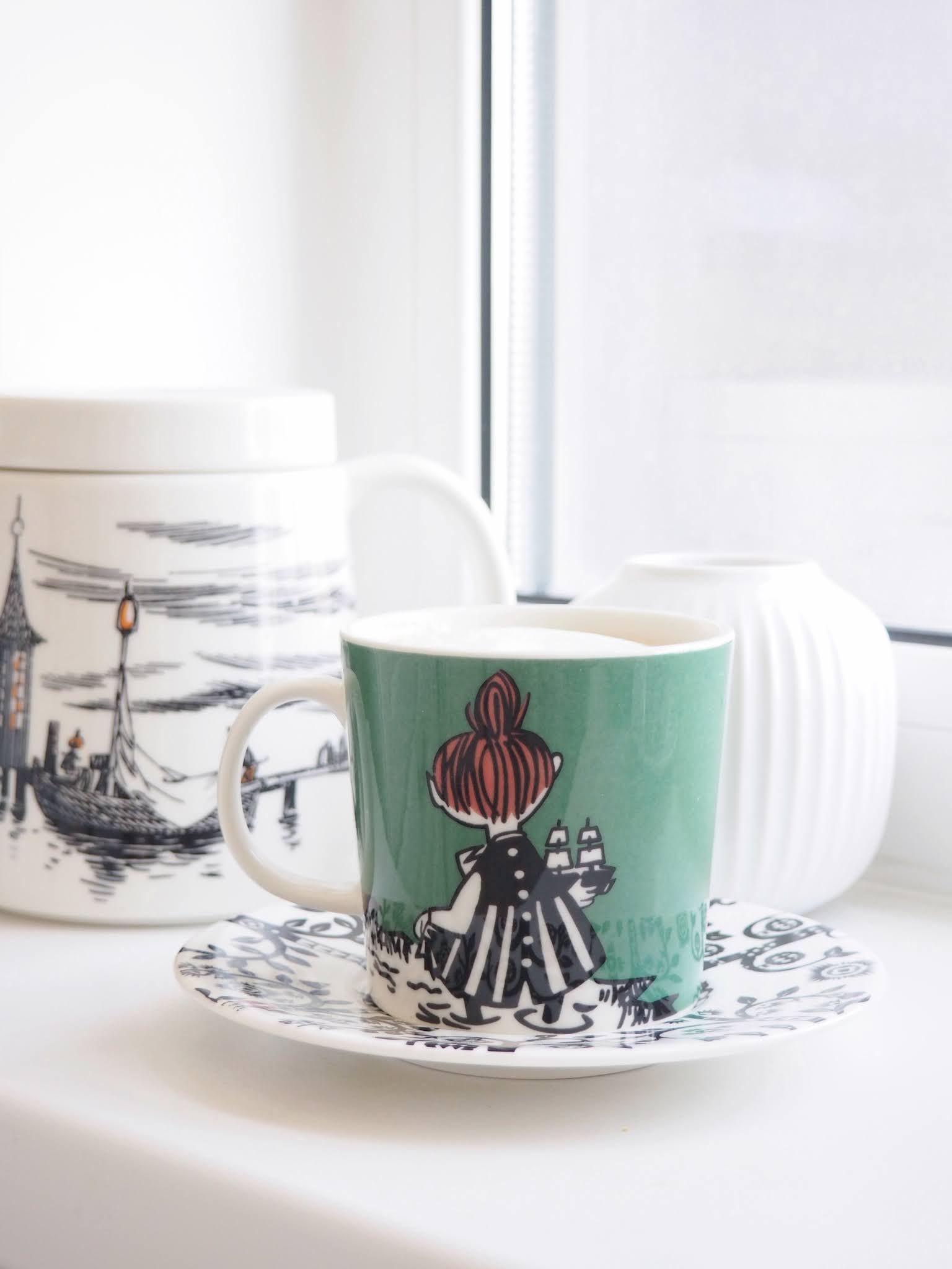 На кружку поместилось много персонажей - фрёкен Снорк, примеряющая платье, Муми-тролль, приносящий Муми-папе конфеты, лев из спектакля, который показвало муми-семейство в своем временном новом «доме» и конечно незаметная крошечная Мю :)